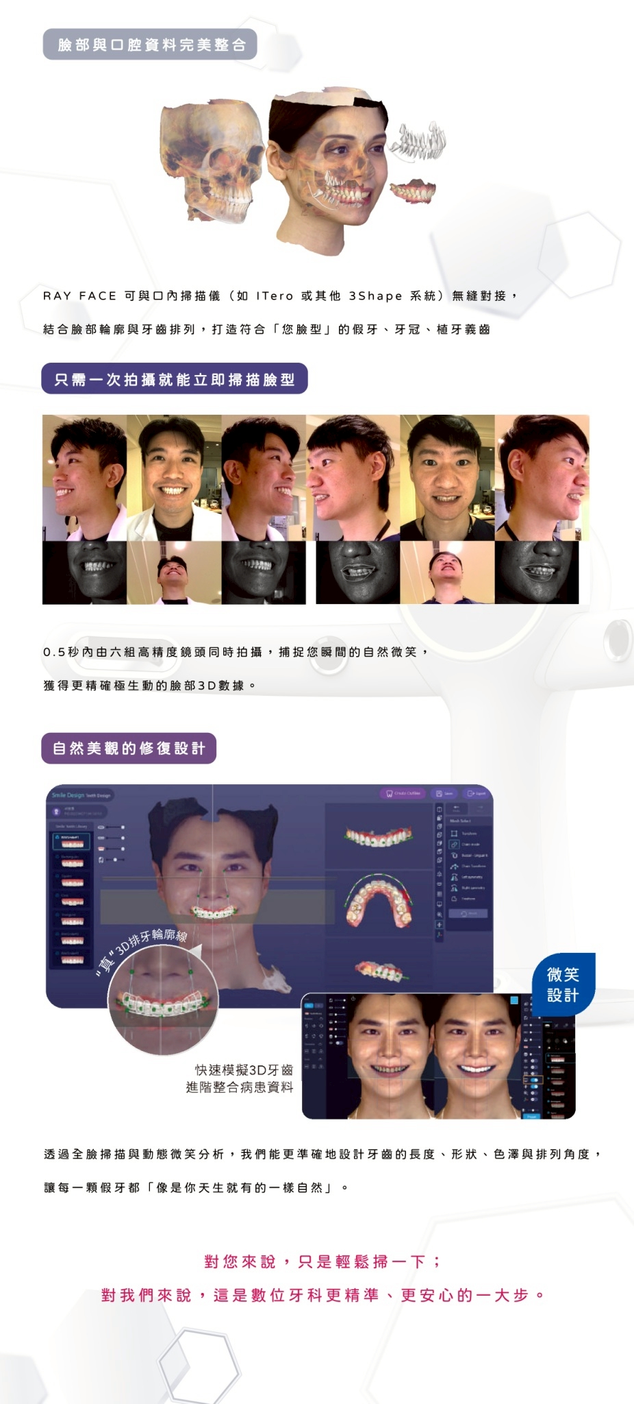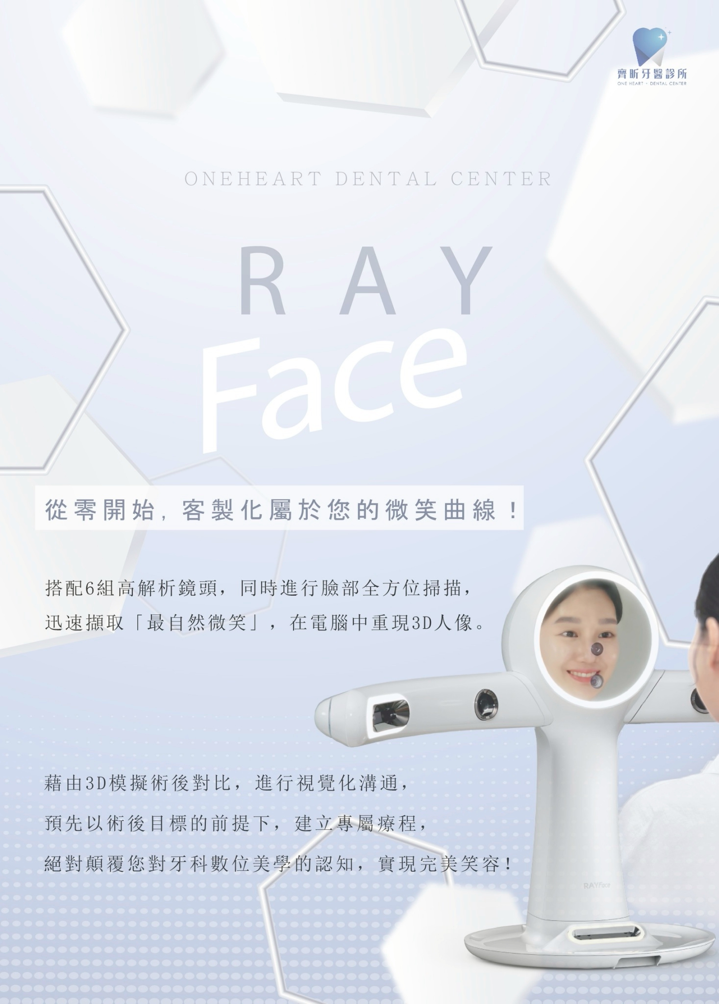 透過高精度3D掃描技術,Ray Face 可以在短短幾秒內擷取整張臉部的立體資料,與口內掃描、X光影像結合後,讓醫師從外觀到骨骼、從微笑設計到咬合調整,都能做出更符合您「整體臉型」的診療判斷。